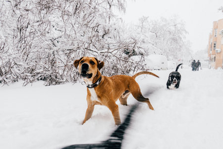 A beagle dog is happily walking on a leash in the snowy weather