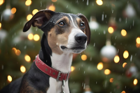 Beagle dog in front of christmas tree on snow background.