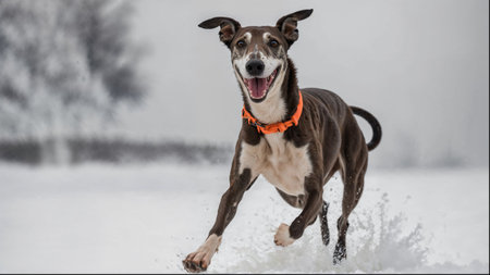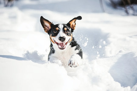 A happy dog leaps through the snow, its ears flapping as it enjoys a playful winter day in a snowy landscape.