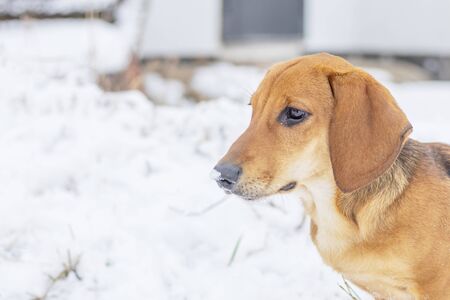Pet breed Dachshund. Winter, snow close-up
