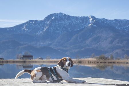 Beagle at the idyllic moor lake Eichsee near Kochel