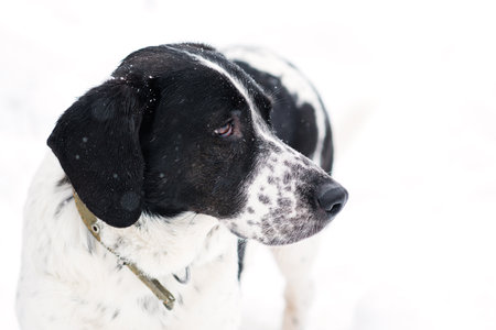 Close-up of a contemplative spotted dog with snowflakes on its fur, against a snowy backdrop, displaying a serene winter gaze.