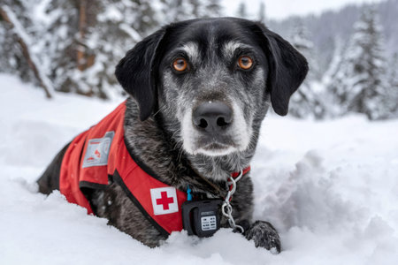 Senior black and gray dog wearing a red search and rescue vest lying down in the snow