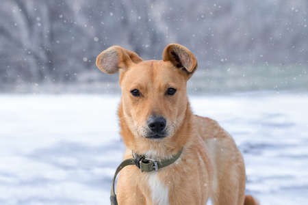 mixed breed dog portrait close up outdoors in winter