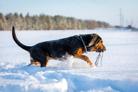 Winter portrait of a black and tan bloodhound puppy playing with a wooden stick on a walk in the snow