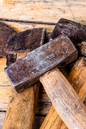 Vintage photo. Old rusty hammers. rotten old wooden mallet.