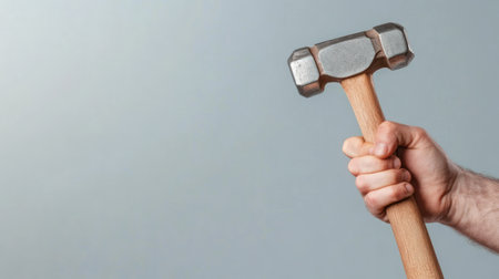 This image shows a heavy metal hammer with a sturdy wooden handle against a bright yellow background. Perfect for showcasing construction, DIY projects, and craftsmanship.