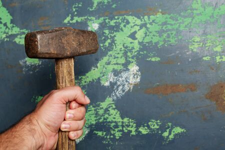 Hit and destroy the concept. Hands of a strong man with a sledgehammer