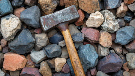 A sturdy hammer lies on a bed of assorted rocks, showcasing various colors and textures. The tool's wooden handle contrasts with the rocky surface, highlighting their natural beauty.