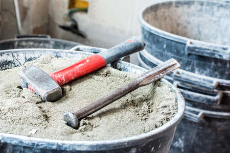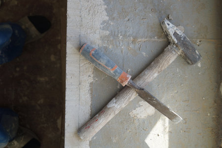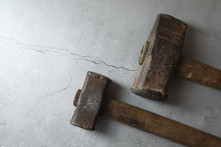 Old steel hammer on concrete floor. Strong hammer with wooden handle. Vintage workshop background
