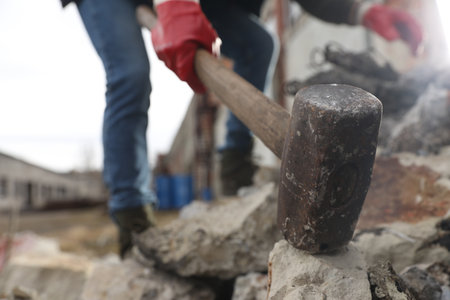 A high-energy scene depicting a hammer striking rock, creating dust and debris. This image captures the essence of manual labor in a rugged construction environment.