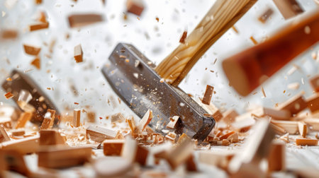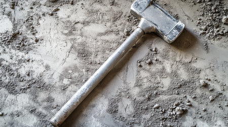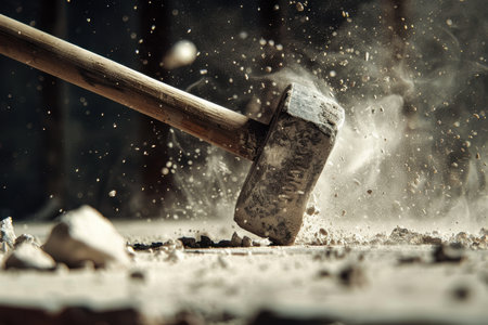 Sledgehammer poised mid-strike against a concrete surface, capturing dynamic motion with dust and debris in the air. the dramatic scene emphasizes force and impact, ideal for themes of construction, destruction, and raw power.
