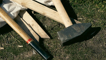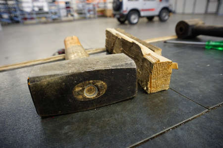 the old construction tool the axe the hammer heavy lies on the wooden machine of the builder