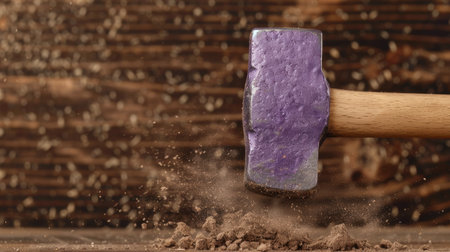 Closeup of a purple crystal hammer smashing on a wooden surface