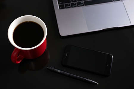 Stylish red coffee cup, phone and laptop on desk table. Black background, business concept, close up, top view