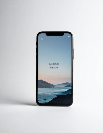 A modern smartphone stands against a clean, white background, its screen a window to a tranquil coastal landscape.
