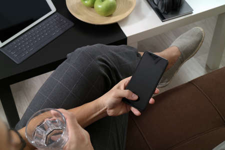 hipster hand using smart phone for mobile payments online business,glass of water,sitting on sofa in living room,green apples in wooden tray