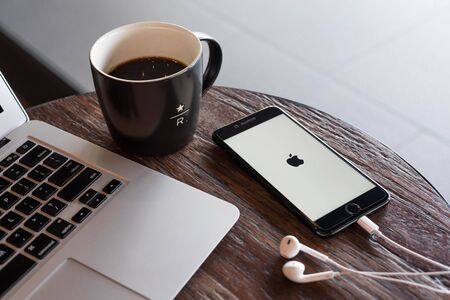 BANGKOK, THAILAND - NOVEMBER 26, 2016: Iphone7 Plus jet black serie on opening screen of Apple inc. icon with macbook air