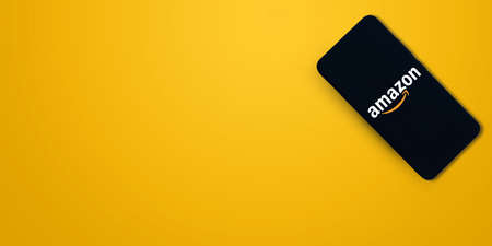 Amazon on Mobile Screen with Empty Yellow Space Attractive Banner Design. Online Shopping concept backdrop free space for text in black