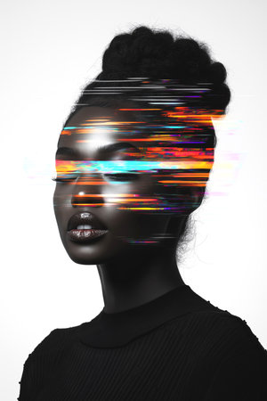 Glitch effect creates a distorted portrait with vibrant colors and sharp contrasts