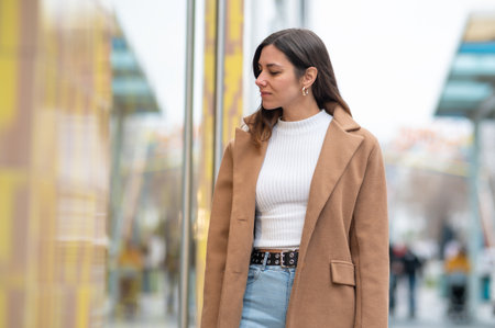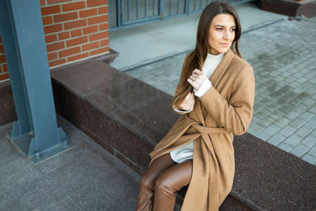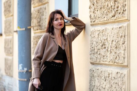 Beautiful lady in spring clothes, wearing a brown coat, standing on the background of a beige wall, looking into the camera. Stylish girl against the background of the wall. Copyspace