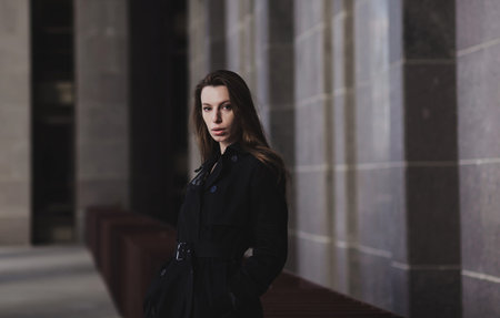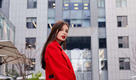 Charming stunning mysterious elegant girl with brown hair and blue eyes in black golf and a red autumn coat looks sexy and tender in the frame. Cloudy weather, gray building, lady in city.