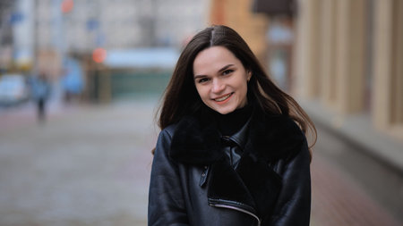 Beautiful modern girl with long brown hair dressed in a leather jacket and jeans walks on the street on an overcast, snowy winter day. People and life.