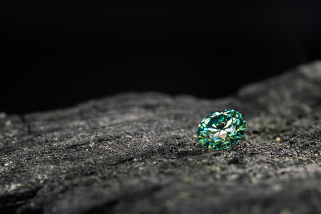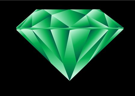 A green gemstone is on a black background. The gemstone is shiny and has a green color