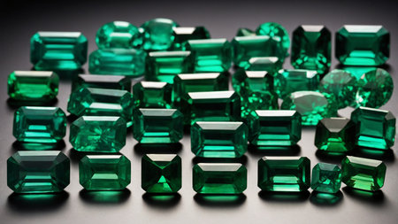 A collection of emerald gemstones in different shapes and cuts, showing the vibrant green color and clarity of each stone in an exquisite arrangement perfect for jewelry making and collection. AI generated image