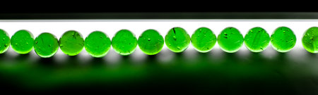 A pile of green gemstones on a black surface. The stones are all different shapes and sizes, but they all have a similar color. The scene is calm and peaceful