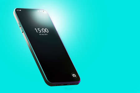 Phone lock screen design. Lock screen of a modern phone. Smartphone on a turquoise background. Cellphone with thin bezels. Realistic cellphone template. Concept - sale of phones. 3d rendering