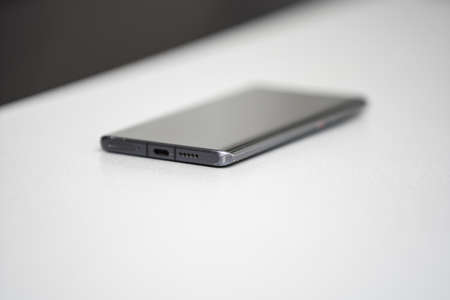 Usb type-c connector on the end of the smartphone, close-up.