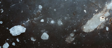 Aerial View of Cracked Ice Surface with Intricate Patterns. Concept of Natural Textures, Winter Beauty, Cold Environment, and Fragility of Nature. Banner. Background. Copy space.