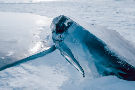 Ice of Lake Baikal, the deepest and largest freshwater lake by volume in the world, located in southern Siberia, Russia