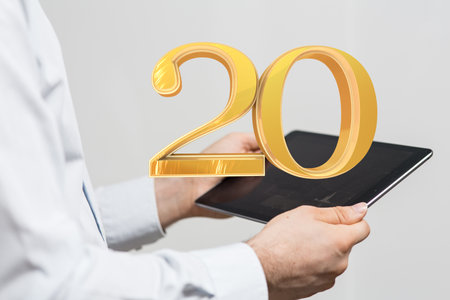 Graphic numbers: Number 20 made of white balloons on blue background. 3D rendering