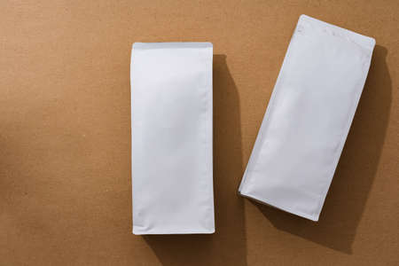 White coffee pouch mockup, diagonal packaging presentation, top view, isolated on background. Set bag. Doy pack template with degassing valve, for coffee beans, loose tea, for design