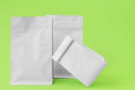 Zipper stand-up pouches on green background, top view. Mockup for design