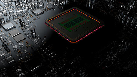 Circuit board futuristic server code processing. CPU, central processing unit. 3D rendering