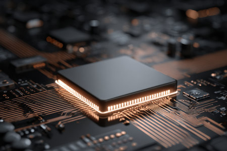 Close-up view of an illuminated microchip on a circuit board, featuring intricate lines and electronic components. This high-tech image represents innovation and advancement in technology.