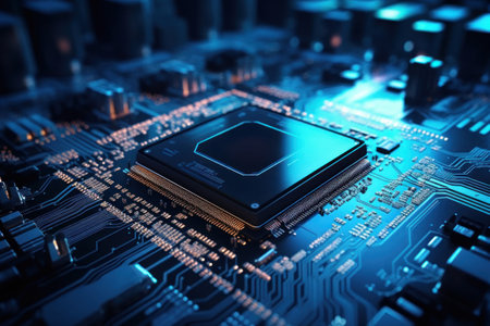 A futuristic computer circuit in blue with neon lights in the background. A high quality image making by generative ai.