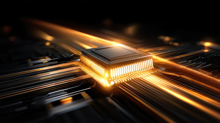A captivating close-up image of a glowing microprocessor that highlights the intricate details of circuitry and the dynamic essence of modern technology and innovation.