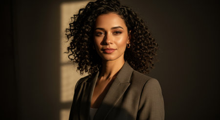 Portrait of a confident young adult woman with curly hair wearing a blazer, illuminated by dramatic natural light and shadows from a window.