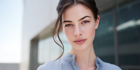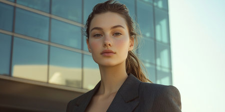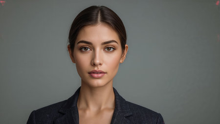 Detailed portrait of a businesswoman with clear skin and a professional expression, wearing business attire and exuding confidence and leadership.