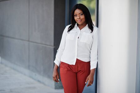 Formally dressed african american business woman in white blouse and red trousers. Successful dark skinned businesswoman.