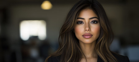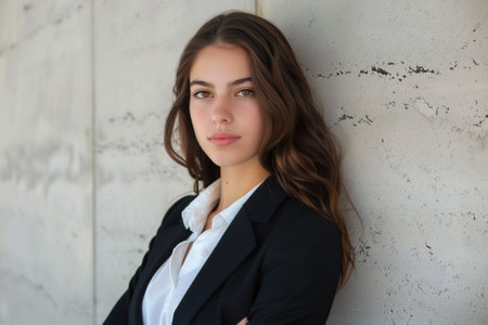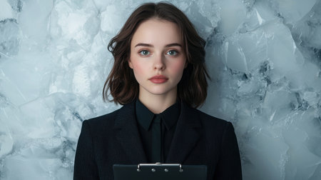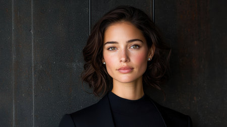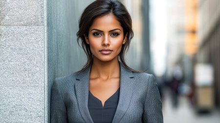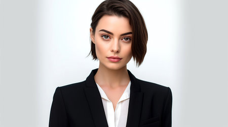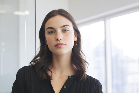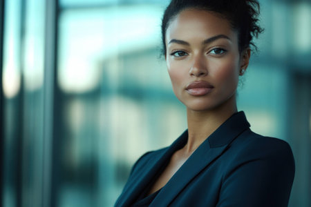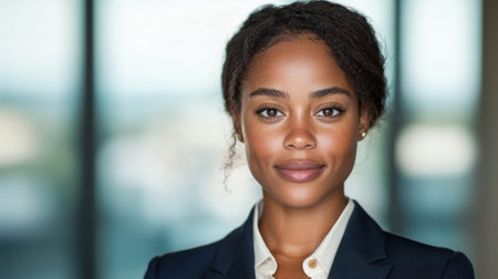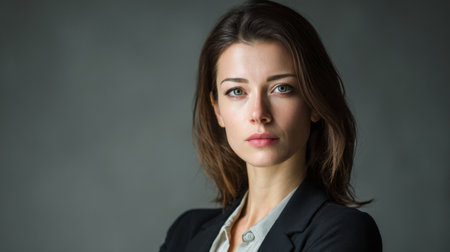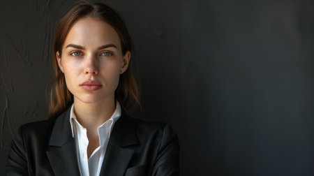 This portrait captures a confident woman exuding professionalism and strength. Her serious expression and elegant attire convey determination and beauty.