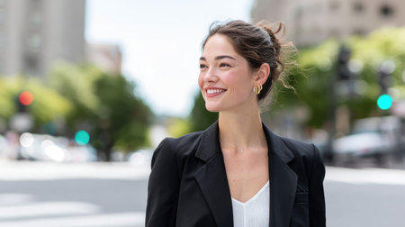 A joyful young woman in a fashionable black blazer walks in a bustling cityscape, radiating confidence and positivity under the warm sunlight.