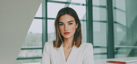 Confident young woman in business attire poses with a strong expression. The portrait captures elegance and professionalism in a modern office environment.