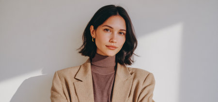 pretty young model in turtleneck and blazer isolated on beige, banner