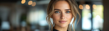 This professional headshot portrays a confident, successful young businesswoman With a stylish blonde hairstyle and striking blue eyes, she smiles warmly in formal attire The modern office background complements her elegant and attractive presence, projecting leadership and happiness She embodies a professional, accomplished female entrepreneur AI Generative