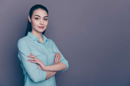 Photo of charming sweet business cute smiling joyful professional attorney journalist standing with hands folded staring with her deep hazel eyes isolated over grey color background